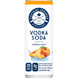 Imagine natural Peach paired with a premium vodka Soda. That's Cottage Springs Ontario Peach Vodka Soda. Small batch crafted with care, prefect for any occasion. Only 99 calories, sugar and sweetener free and still 5% alcohol.